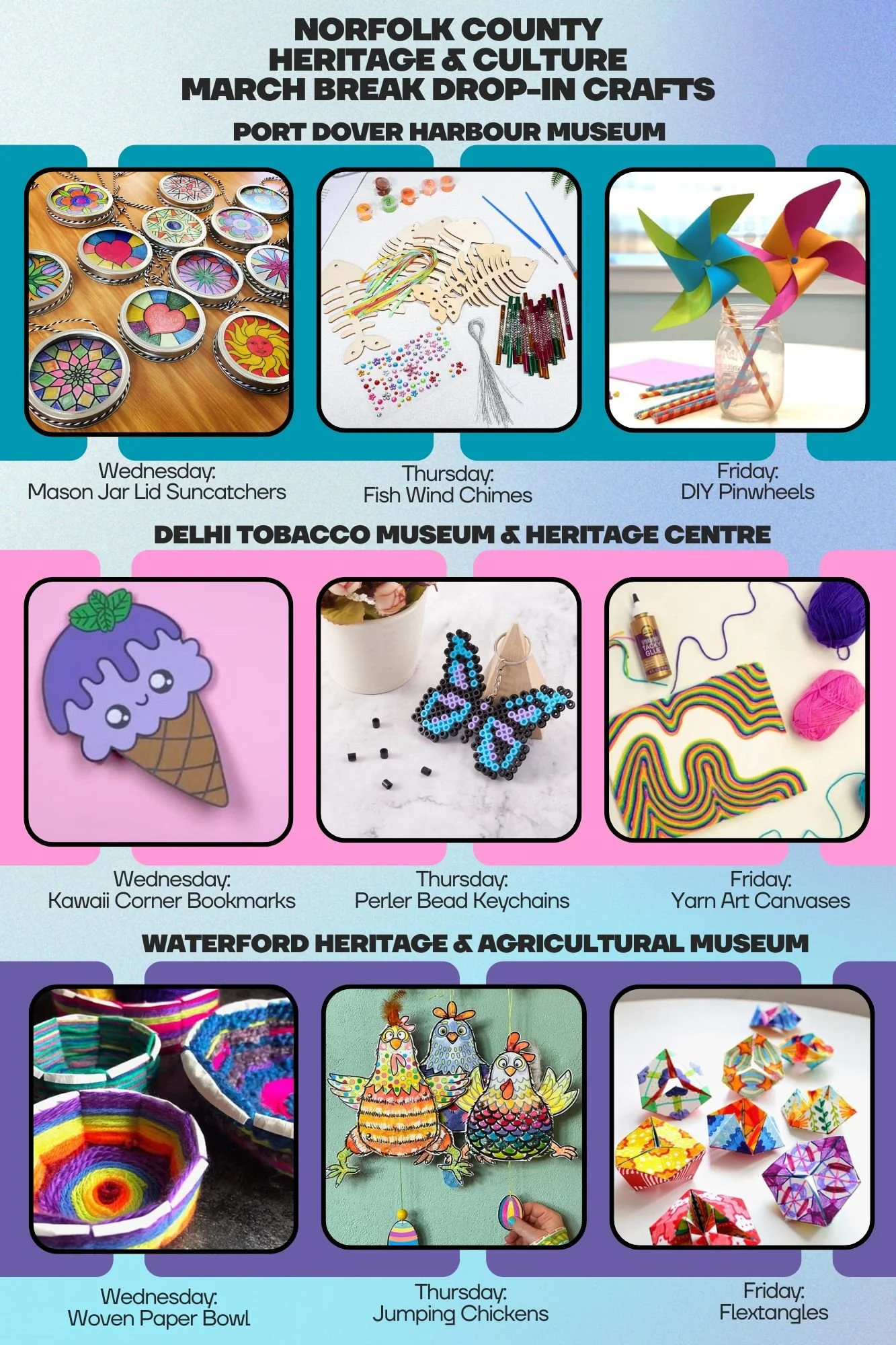 From Wednesday through Friday during March Break, the Delhi Tobacco Museum & Heritage Centre, Port Dover Harbour Museum, and Waterford Heritage & Agricultural Museum will each have a different fun craft for kids ages 5-10. Feel free to come back each day for a new craft! And don’t forget to take a look around the museum and complete a seasonal scavenger hunt while you’re here.